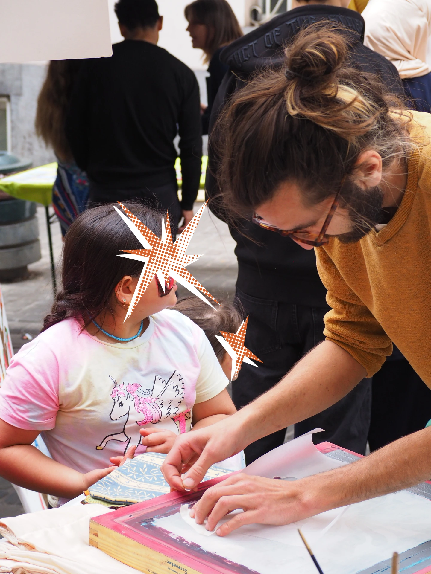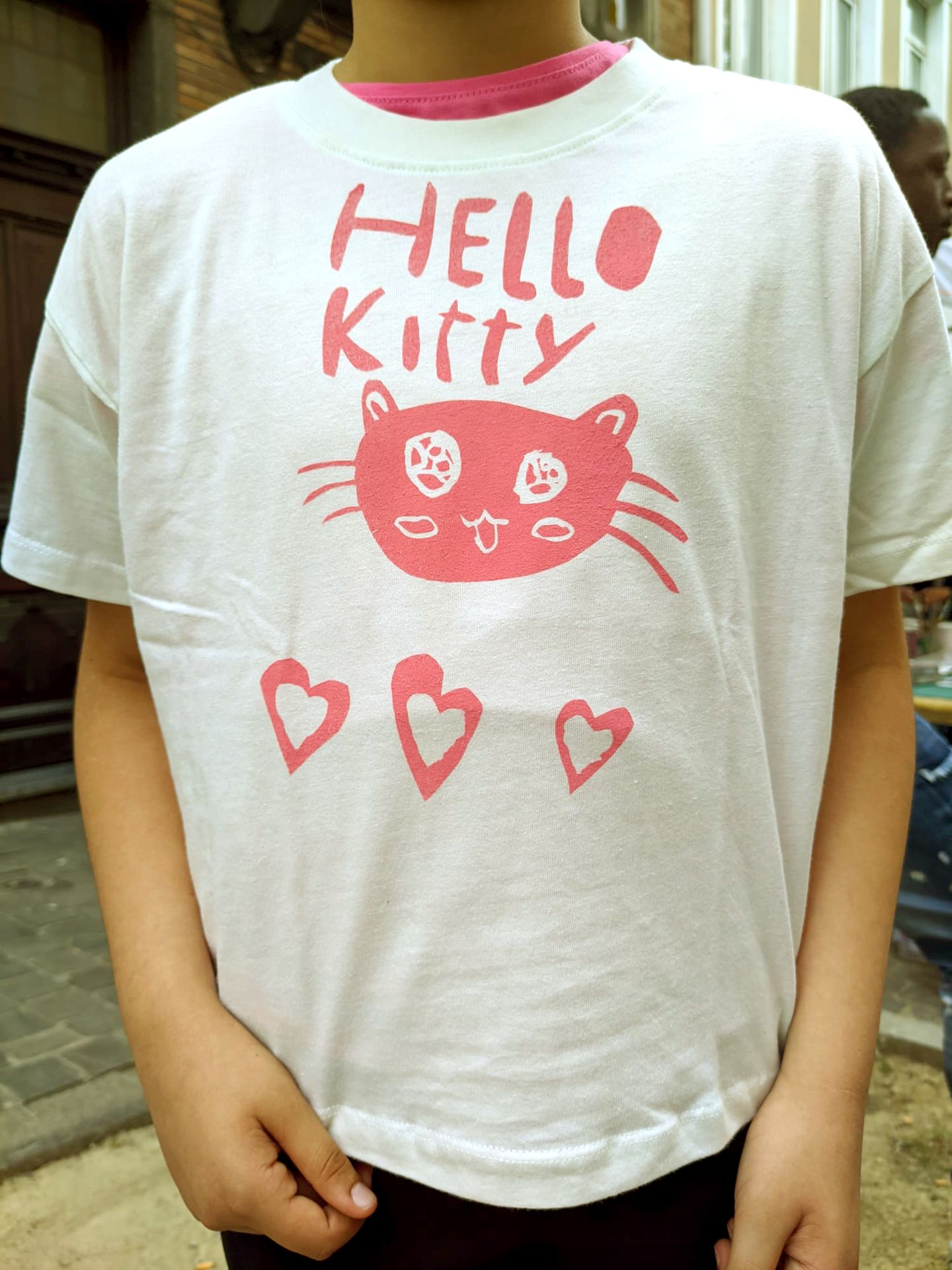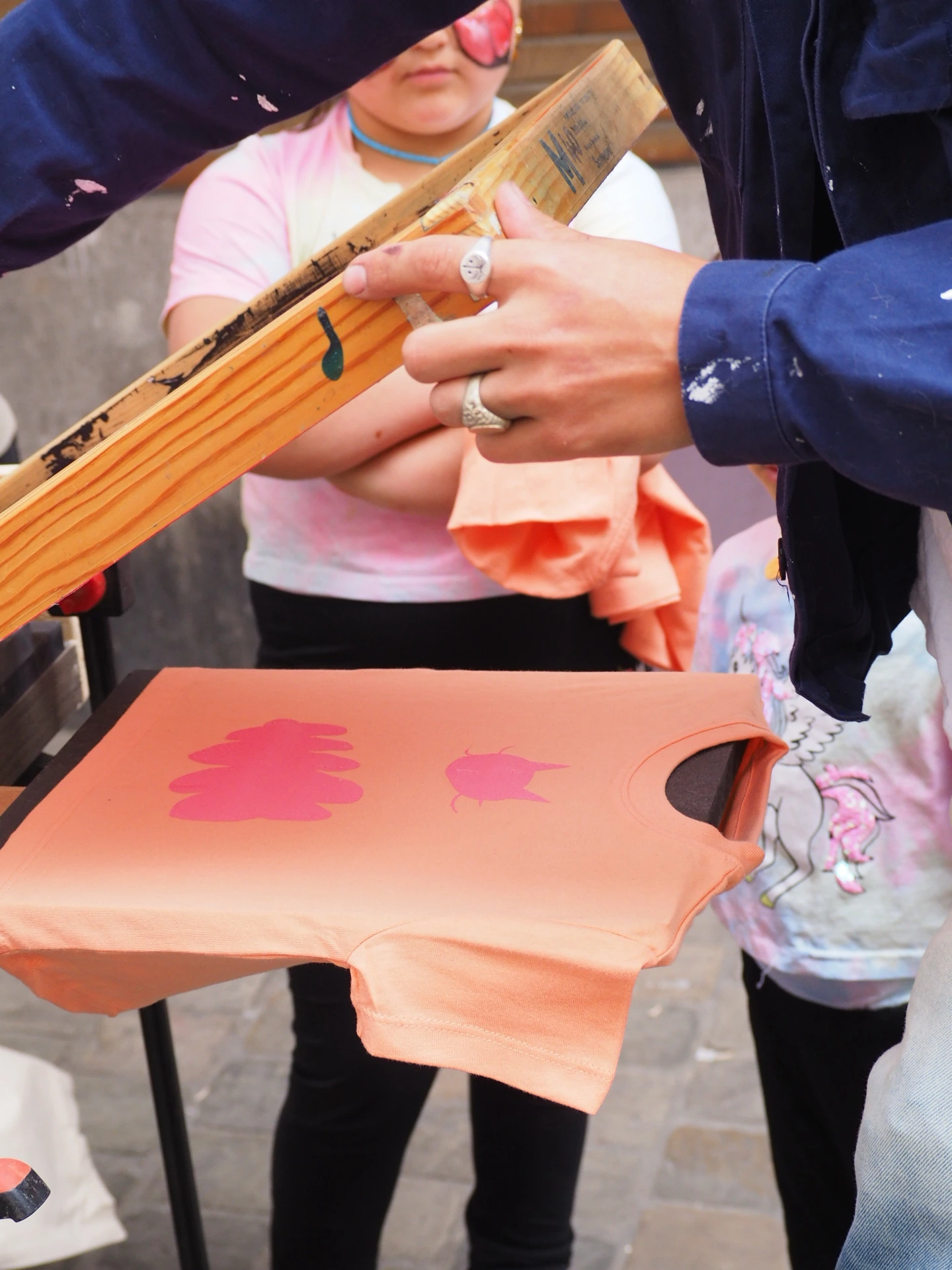 Brabant-Verte 2025, la Maison des Parents nous a invité à tenir un atelier de sérigraphie dans la rue ! Pour s’adapter à un public enfantin et à une pratique extérieure, le processus traditionnel a été abandonné au profit d'une pratique par découpe de papier. Les mini-artistes ont dessiné leurs visuels sur une page de calque avant de la découper, la coller sur un de nos cadres de sérigraphie maison, puis d'ajouter quelques détails au pinceau. Ils ont pu en suite l'imprimer sur des vêtements pour repartir avec. (Tout manquement de leur part aux droits d'auteurs est purement innocente.)